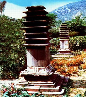 道憑法師雙石塔位于安陽(yáng)西南30公里靈泉寺基址東側(cè)。這里原為東魏名剎寶山寺,寺已廢沒(méi),塔尚完整,雙塔東西并列,相距3.2米,單層石 造。西塔,基臺(tái)為正方形,由下大上小兩塊青色石塊壘疊而成。塔身高 2.22米,用整塊青石雕鑿而成,其東、西、北三面無(wú)飾,南壁開(kāi)長(zhǎng)方狀 拱門(mén),門(mén)高31厘米,寬20厘米,進(jìn)深31厘米。門(mén)左右兩側(cè)刻出半圓形倚 柱,柱頭刻蓮瓣,柱礎(chǔ)呈覆蓮狀。塔身以上刻出疊澀出檐3層。在門(mén)楣 與檐部之間,鐫刻有“道憑法師燒身塔,大齊河清二年(563年)三月 二十七日”楷書(shū)塔銘。塔心室為正方形。塔頂呈覆缽狀,雕刻華麗,四 面雕卷葉狀紋飾,正中皆雕一圓形寶珠。全塔造型穩(wěn)固而美觀,尤以塔 身中部呈束腰狀,別具一格。東塔除塔門(mén)形制和塔身花紋與西塔略有不 同外,其它與西塔相同,為一陪塔。道憑法師為東魏和北齊兩代著名高僧。唐代道宣《續(xù)高僧傳》有載。這兩座塔為我國(guó)最早的石塔,具有重要價(jià)值。