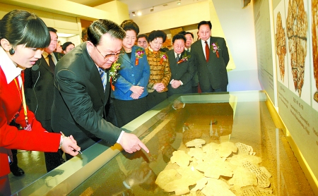 開館儀式后,李長春興致勃勃地參觀了博物館陳列展覽,認真聽取漢字起源、發(fā)展和演變情況的介紹,了解我國少數(shù)民族文字發(fā)展情況,仔細觀看殷墟甲骨文的發(fā)現(xiàn)、發(fā)掘和研究歷程,他對中國文字博物館運用多種方式,特別是現(xiàn)代聲光電技術(shù)展示給予充分肯定。