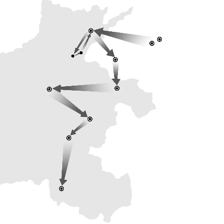 曲阜——兗州——帝丘(濮陽)——匡——蒲(長垣)——帝丘(濮陽)——陶丘(定陶)——宋(商丘)——鄭(新鄭)——陳(淮陽)——蔡(上蔡)——負(fù)函(信陽)