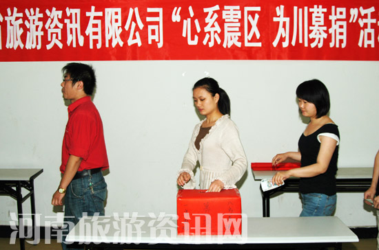 自5月12日四川汶川縣發(fā)生7.8級(jí)特大地震以來,震區(qū)人民的安危及生活狀況就一直牽動(dòng)著河南旅游資訊有限公司全體員工的心。為了表達(dá)對(duì)災(zāi)區(qū)人民身處危難之中的深切關(guān)懷之情,響應(yīng)省旅游局黨組的號(hào)召,河南旅游資訊有限公司于5月15日舉行“心系震區(qū) 為川募捐”活動(dòng),河南旅游資訊有限公司全體員工紛紛慷慨解囊,向?yàn)?zāi)區(qū)人民伸出援助之手。 河南風(fēng)國際旅行社有限公司也于同日舉行了捐款活動(dòng)。