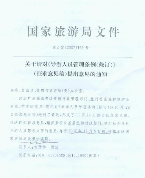 關(guān)于請對《導(dǎo)游人員管理條例(修訂)》(征求意見稿)提出意見的通知