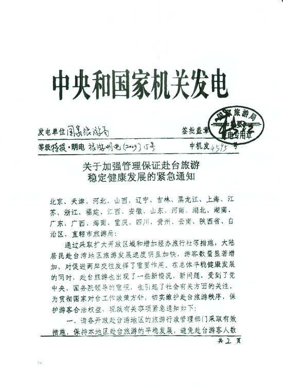 關(guān)于加強(qiáng)管理保證赴臺旅游穩(wěn)定健康發(fā)展的緊急通知