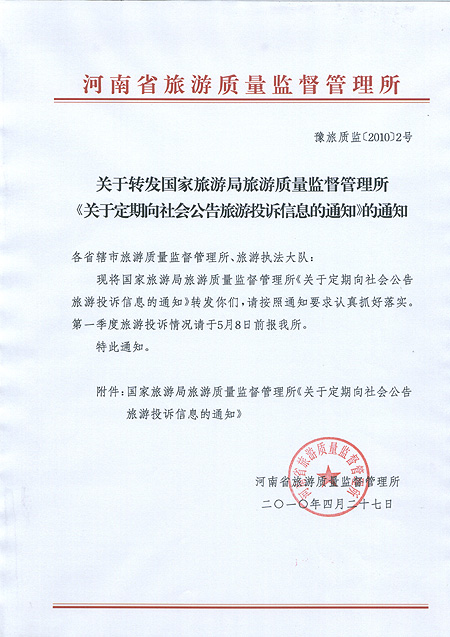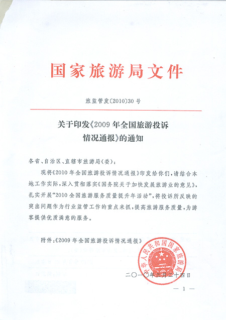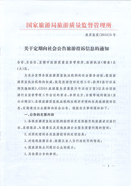 關(guān)于轉(zhuǎn)發(fā)國(guó)家旅游局旅游質(zhì)量監(jiān)督管理所《關(guān)于定期向社會(huì)公告旅游投訴信息的通知》的通知