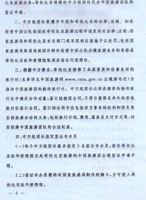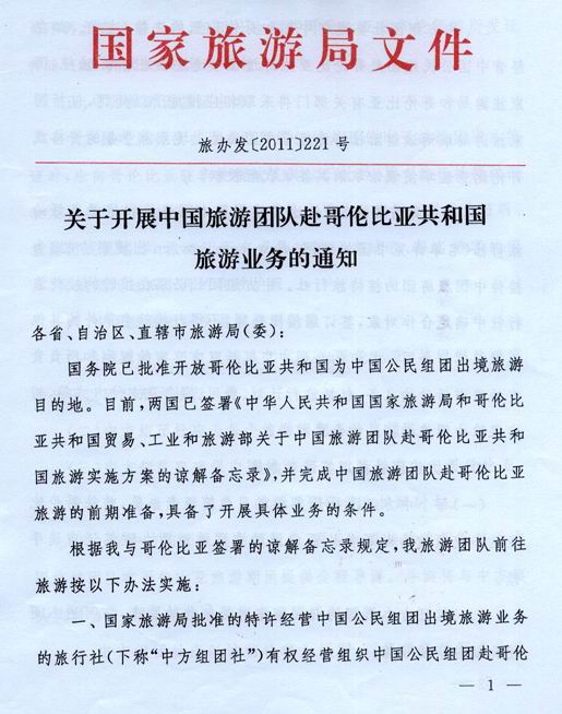 國家旅游局關(guān)于開展中國旅游團(tuán)隊(duì)赴哥倫比亞共和國旅游業(yè)務(wù)的通知