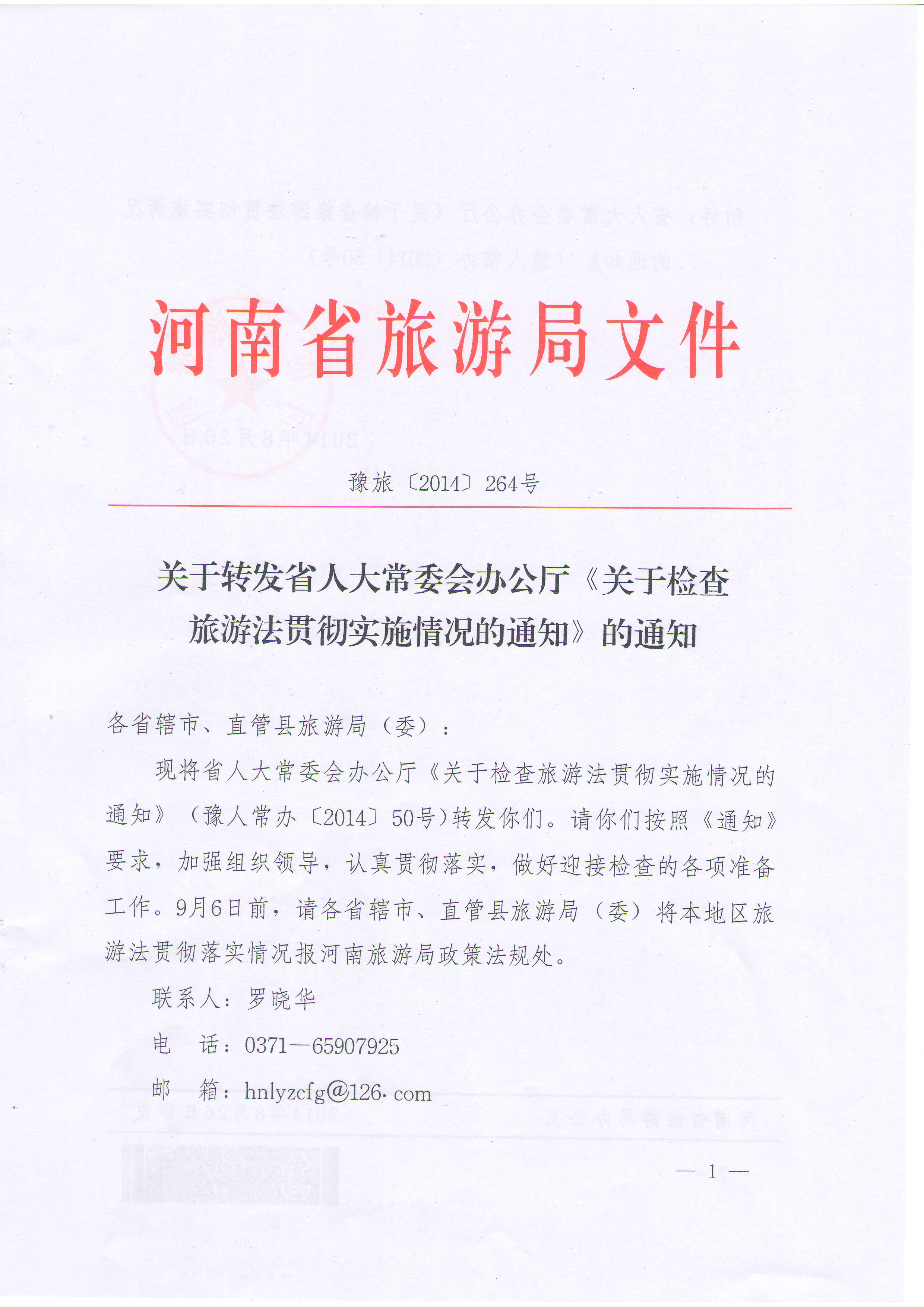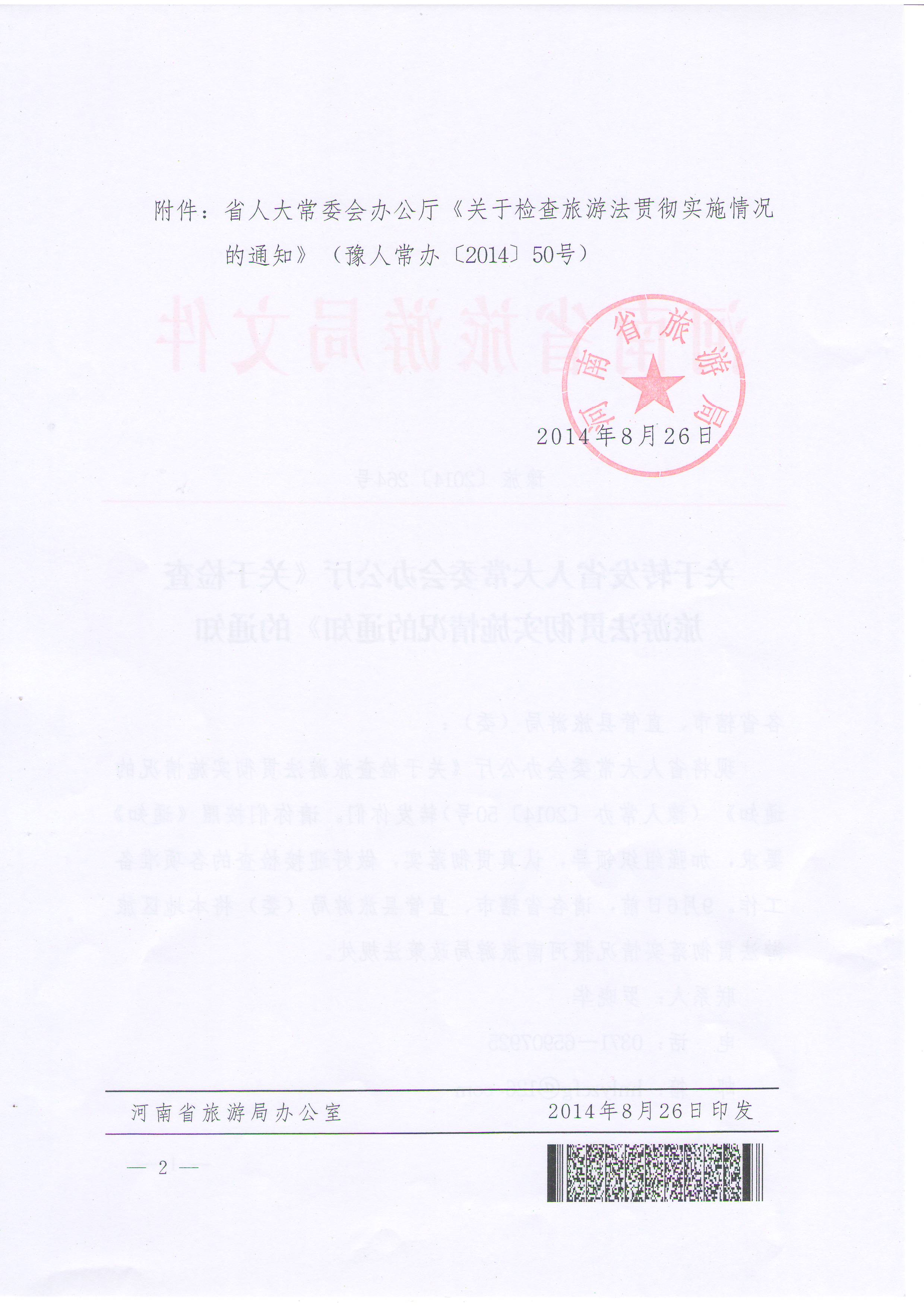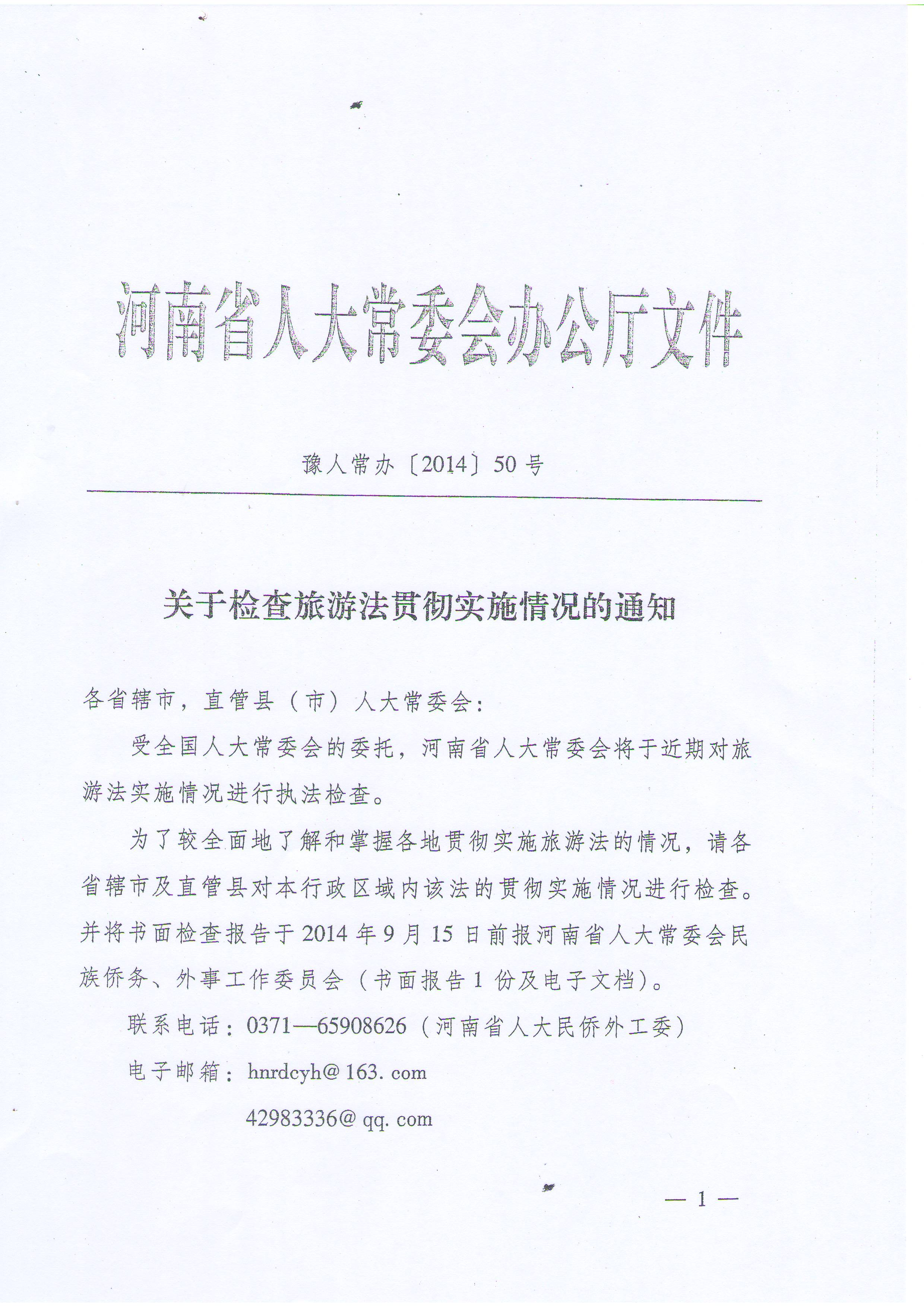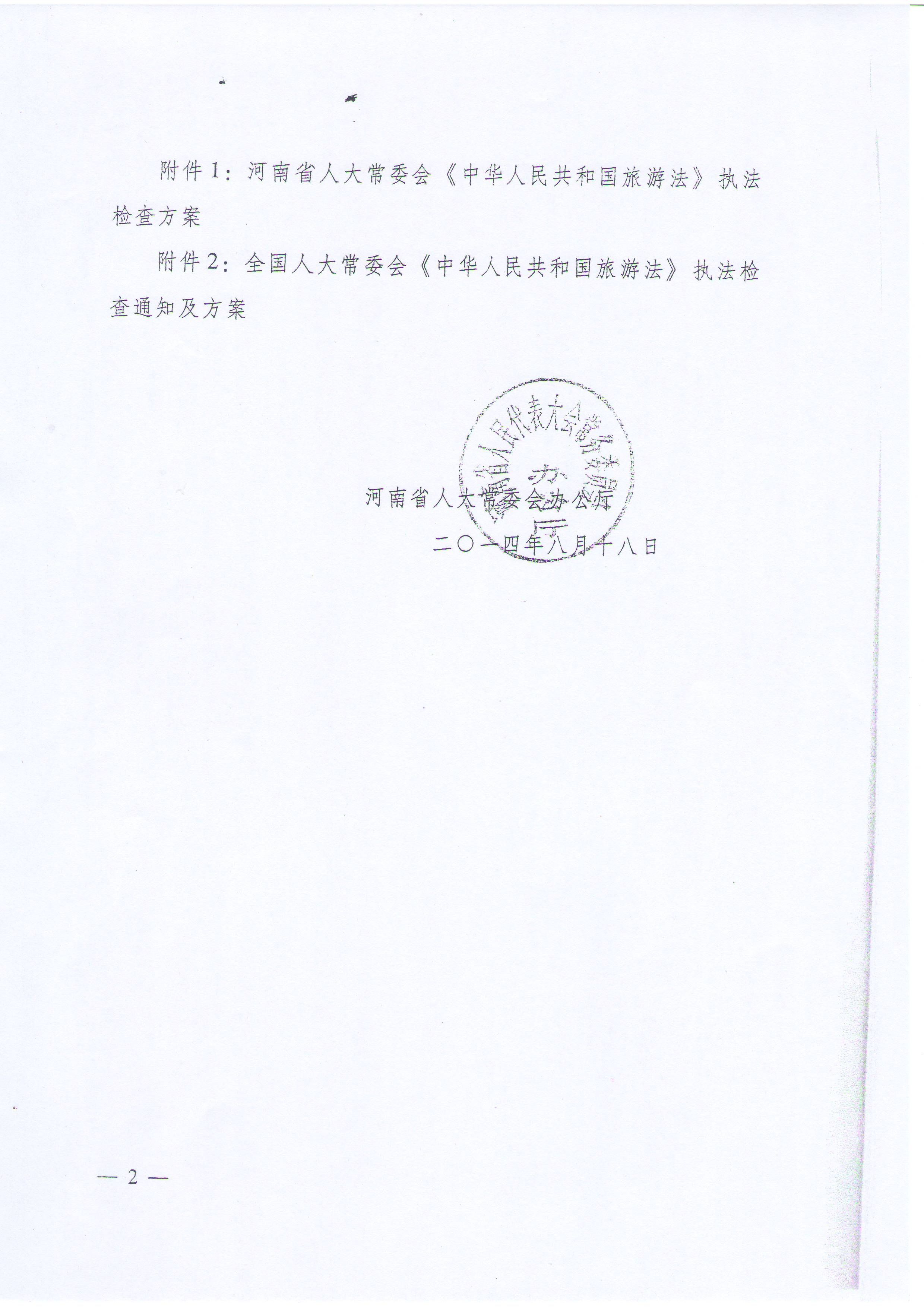 附件:省人大常委會(huì)辦公廳《關(guān)于檢查旅游法貫徹實(shí)施情況的通知》(豫人常辦〔2014〕50號(hào))