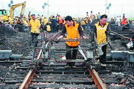 為確保奧運期間列車的安全通行,鄭州鐵路北站的職工從7月份開始,便投入到保安全保暢通迎奧運戰(zhàn)斗中。他們發(fā)揚團隊精神,優(yōu)化組織運輸方案,細(xì)化施工措施,對岔道進行大修施工,以保證每列途經(jīng)火車的安全。圖為該站職工在下行駝峰區(qū)施工。