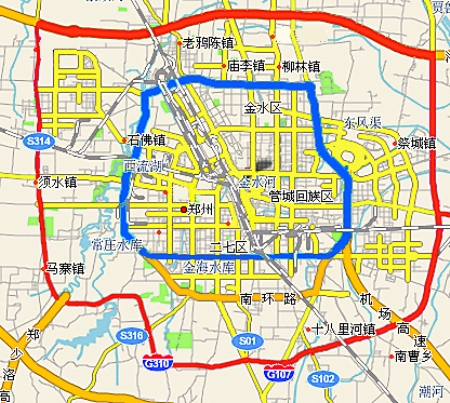 *鄭州市區(qū)禁鳴區(qū)域示意圖。市區(qū)連霍高速以南、西四環(huán)路以東、107國(guó)道以西、南四環(huán)路以北(均不含以上道路)的區(qū)域內(nèi),全天24小時(shí)禁止鳴喇叭。圖中紅線內(nèi)區(qū)域即為新禁鳴區(qū)域,藍(lán)線內(nèi)區(qū)域?yàn)槔辖Q區(qū)域。