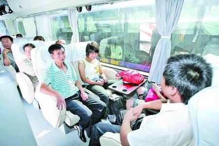 記者進入車內(nèi)看到,這種超豪華大巴內(nèi)配有2臺電視,安裝有雙探頭、CDMA全程安全監(jiān)控系統(tǒng),可將車內(nèi)情況一覽無余。一旦車內(nèi)發(fā)生意外或偷竊,鄭州交運集團監(jiān)控中心可以隨時查看車內(nèi)情況,為旅客出行提供安全保證。車內(nèi)還配有冷暖空調(diào)、飲水機、衛(wèi)生間等設(shè)施,乘務(wù)員為旅客提供“陸地航空”式服務(wù),但是票價并未調(diào)整,仍為115元。