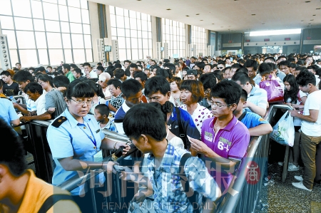 昨日上午,鄭州火車站東廣場上每個進(jìn)站口前都排成了小“長龍”,候車室內(nèi)也變得相對擁擠。