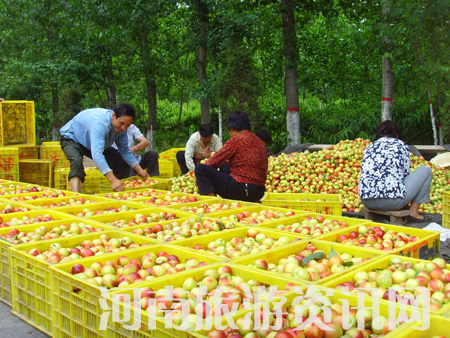 約幾位好友早7點(diǎn),從南陽(yáng)向北沿著312國(guó)道、S249公路,驅(qū)車一個(gè)半小時(shí),就來(lái)到了中國(guó)最大的油桃之鄉(xiāng)內(nèi)鄉(xiāng)赤眉鎮(zhèn)?吹窖赝旧奂?guī)X、楊店、東北川、魚(yú)貫口村碩果累累的美景惹人眼紅,忍不住下車親手摸摸新鮮的油桃,到路邊的果林里摘上幾個(gè)鮮桃。你看,面帶笑容的果農(nóng)用摩托車、拉車載的一框框、一籃籃紅燦燦豐收的油桃正往路邊的批發(fā)市場(chǎng)運(yùn),用他們的話說(shuō)“我的油桃個(gè)大、顏色鮮,趕早要賣個(gè)好價(jià)錢(qián)”,詳細(xì)詢問(wèn)了一下,這些油桃專業(yè)村的果農(nóng)人圴一畝地,僅油桃這一項(xiàng)人均收入就達(dá)4500元左右,已成為農(nóng)民收入的主要來(lái)源。批發(fā)市場(chǎng)上,首先看到的是絡(luò)繹不絕的客商和長(zhǎng)蛇般的車輛,有襄樊、宜昌、西安、蘭州、山東、烏魯木齊、呼和浩特、吉林、廣州、上海等地的油桃收購(gòu)車輛。選桃、談價(jià)、過(guò)稱之后,油桃就被留了下來(lái),收購(gòu)商開(kāi)始忙碌了,三五成群分包一大堆,用干凈的布把桃一個(gè)個(gè)擦拭之后放入車上的果框,擺放整齊,確保經(jīng)得起長(zhǎng)途跋涉的旅途,就這樣油桃被運(yùn)往全國(guó)30多個(gè)大城市,成為都市人們喜愛(ài)的鮮果。這時(shí),兩輛本地的大卡車向我們開(kāi)了過(guò)來(lái),上前詢問(wèn)原來(lái)是楊店村的一位油桃經(jīng)紀(jì)人,他告訴我們,從5月13日開(kāi)始他就開(kāi)始忙起來(lái)了,往年的外地客商早和他約好前來(lái)收購(gòu),他就負(fù)責(zé)收購(gòu)村里果農(nóng)的鮮果,然后由他成批賣給外地客商,每天都能發(fā)走10幾輛100多噸油桃。他還告訴我們,象他這種賺中間差價(jià)的油桃經(jīng)紀(jì)人全鎮(zhèn)有80多人,是由赤眉鎮(zhèn)政府統(tǒng)一組織,與工商部門(mén)共同選定的有責(zé)任心、經(jīng)濟(jì)實(shí)力、信息靈、信譽(yù)好的當(dāng)?shù)啬苋,在每年?月份進(jìn)行業(yè)務(wù)培訓(xùn),并頒發(fā)營(yíng)業(yè)執(zhí)照。據(jù)他透露,一個(gè)月的油桃收購(gòu)季節(jié),他就能賺近萬(wàn)元,引得我們直羨慕。