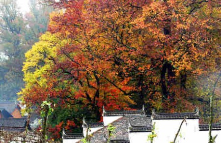 深秋婺源是楓紅的季節(jié),山野、村頭、巷尾、水口處處可見迎風招展、挺拔的古楓、銀杏、紅豆杉,紅艷艷的美得讓人目瞪口呆。遠遠處,高聳的紅豆杉、金黃的銀杏、火紅的楓樹相互間隔著把整片天邊都染成了金紅色。整個鄉(xiāng)村更是像被打翻的染料染過一般,薄薄霧靄掩映下是那粉墻黛瓦的老屋和楓紅杏黃,田間金黃的草垛、辛勤勞作的耕牛和輕輕游蕩的氤氳嵐氣隨時都會飄入眼底。深秋婺源最為迷人時刻是清晨和傍晚,初生的朝陽和落日的余暉在水霧下顯得五彩斑斕,不時更有一兩頭朝出或暮歸的耕牛闖入鏡頭,一切是那么的祥和恬靜。午后的村落里,棱角分明的徽派建筑和圓匾搭建的幾何圖形上,紅、白、黃、綠等色彩斑斕唱著主角,將深秋的古村落更渲染得熱鬧非凡。