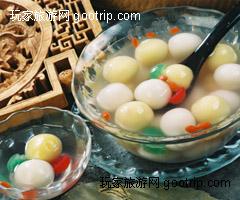 寧波豬油湯圓 以精白水磨糯米粉為皮,用豬油、白糖、黑芝麻粉為餡,湯圓皮薄而滑,白如羊脂,油光發(fā)亮。