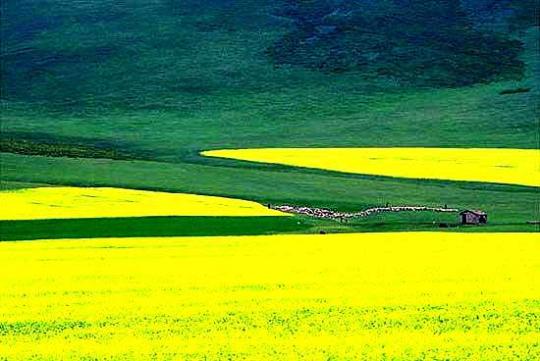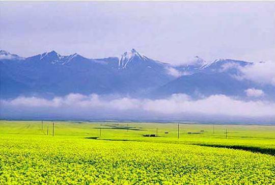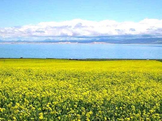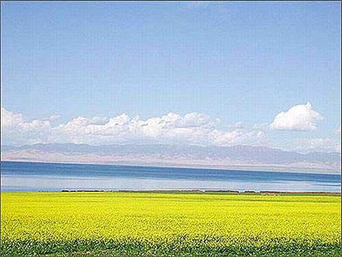 青海湖與岸邊的油菜花組合出一個(gè)美麗的背景,草原上散落的帳篷、牛羊、綠色的草場、淺淺的野花,釋放著迷人的清香。