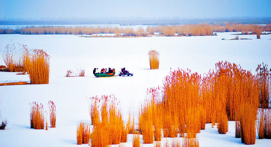 冬季的沙湖擁有豐富的冰雪資源,到處是晶瑩剔透的冰掛樹掛,令大漠風光更顯雄偉圣潔。結(jié)冰后寬廣的湖面成了天然的滑冰場,連綿起伏被雪覆蓋的沙丘則是滑雪愛好者的天堂。在這里,游人可參與冬釣、冬季捕魚、滑雪、陀螺、冰車、雪地摩托車等各項運動,西北人的豪放在各式精彩的雪地運動中一覽無余。