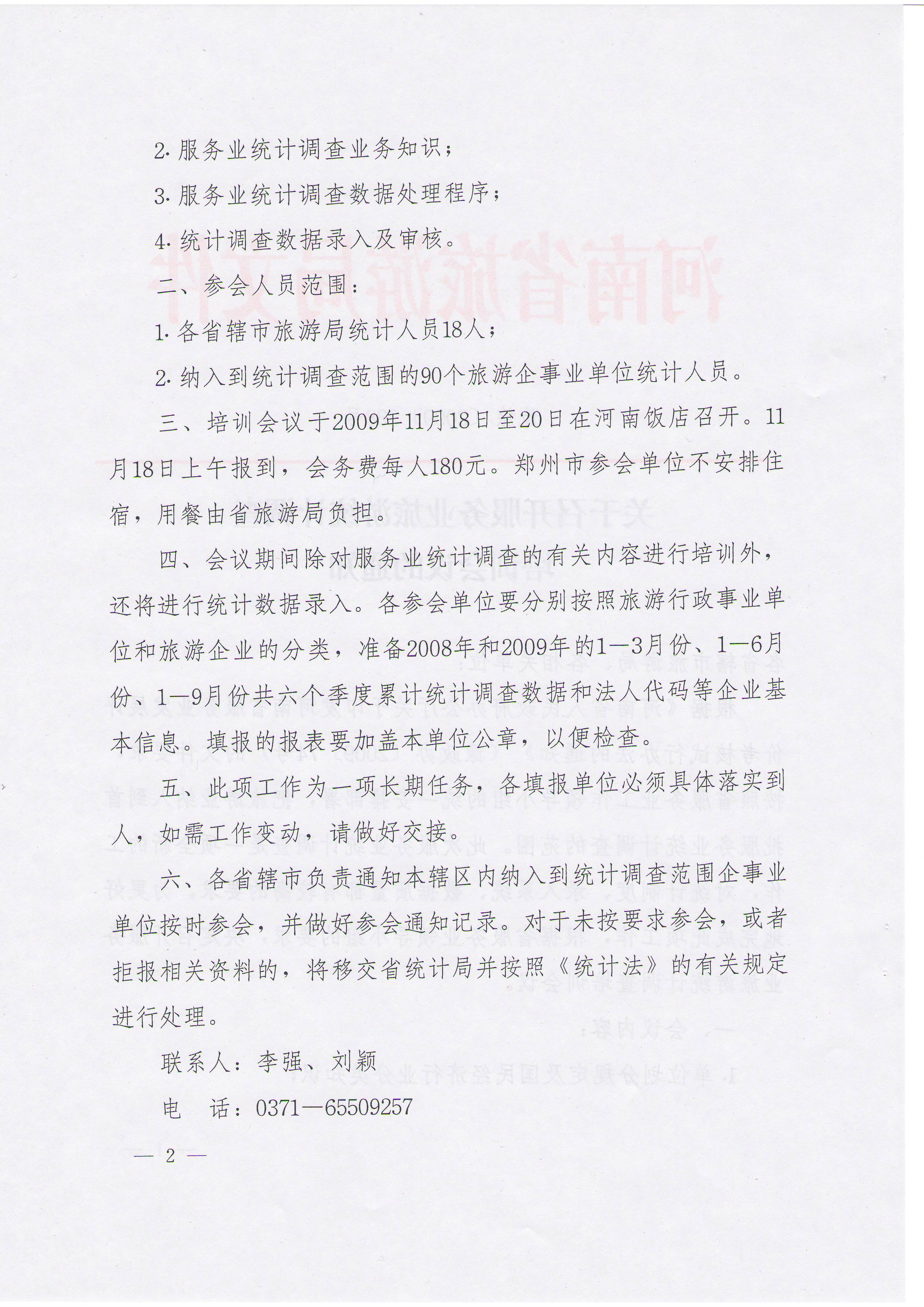 三、培訓會議于2009年11月18日至20日在河南飯店召開。11月18日上午報到,會務費每人180元。鄭州市參會單位不安排住宿,用餐由省旅游局負擔。