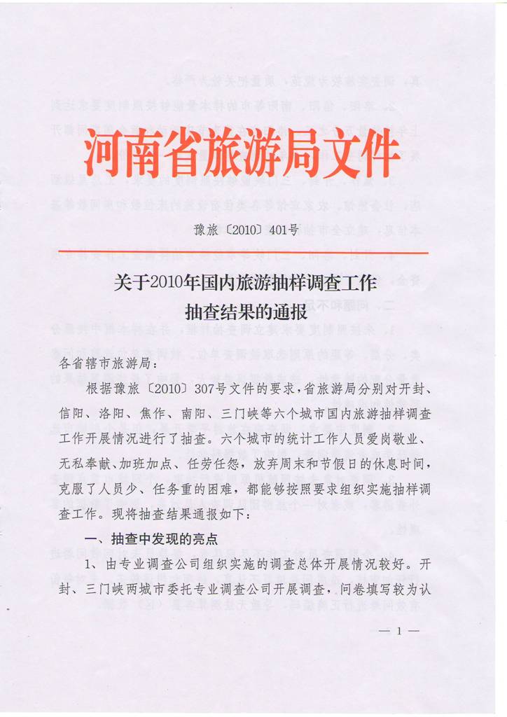 根據(jù)豫旅〔2010〕307號文件的要求,省旅游局分別對開封、信陽、洛陽、焦作、南陽、三門峽等六個城市國內(nèi)旅游抽樣調(diào)查工作開展情況進行了抽查。六個城市的統(tǒng)計工作人員愛崗敬業(yè)、無私奉獻、加班加點、任勞任怨,放棄周末和節(jié)假日的休息時間,克服了人員少、任務(wù)重的困難,都能夠按照要求組織實施抽樣調(diào)查工作。現(xiàn)將抽查結(jié)果通報如下: