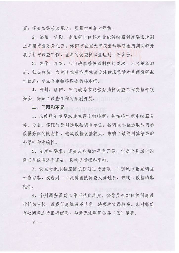 2、洛陽、信陽、南陽等市的樣本量能夠按照制度要求達到上年接待量萬分之三。洛陽市在重大節(jié)慶活動和黃金周期間都開展了抽樣調(diào)查工作,全年的調(diào)查樣本量達到一萬多份。