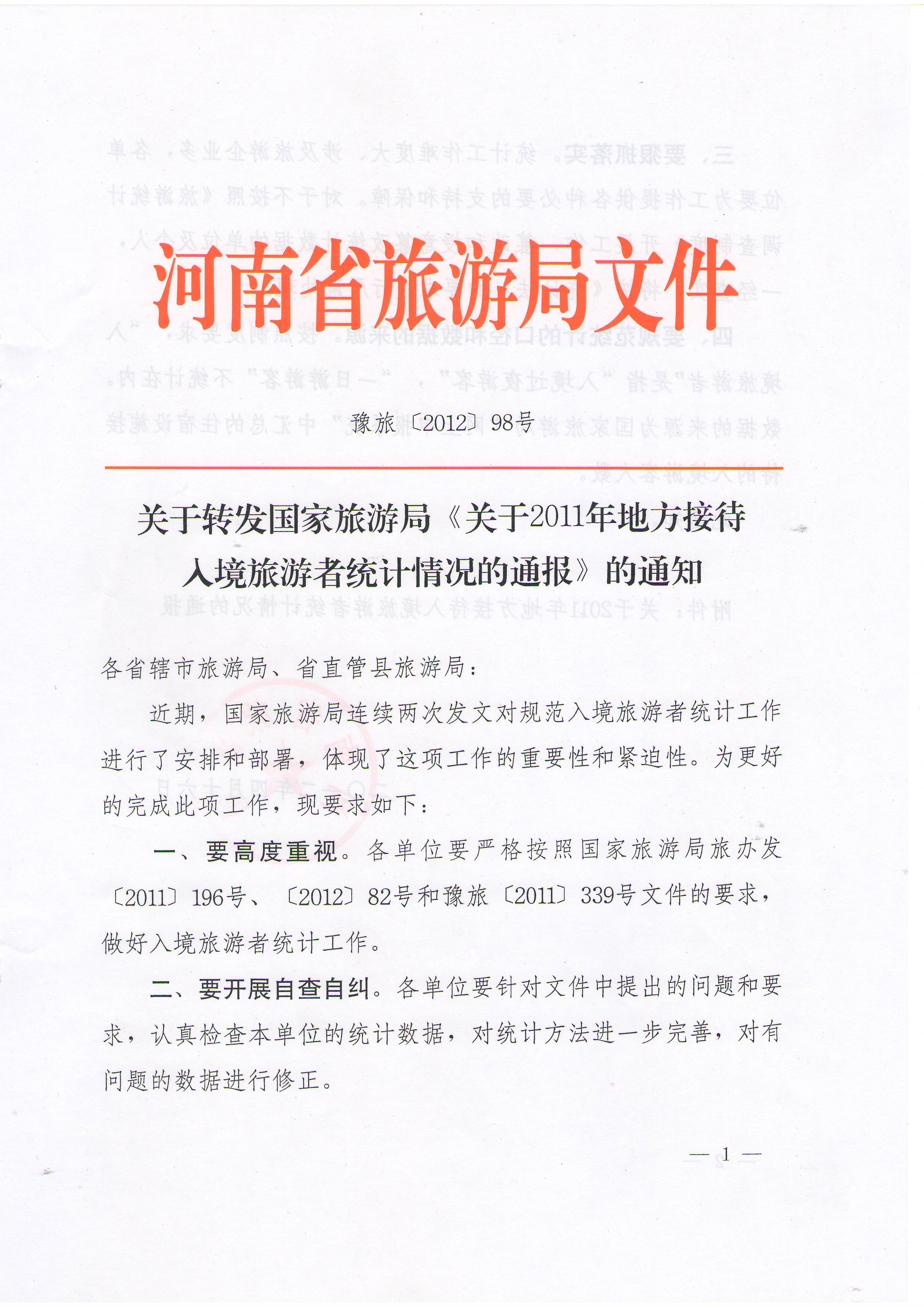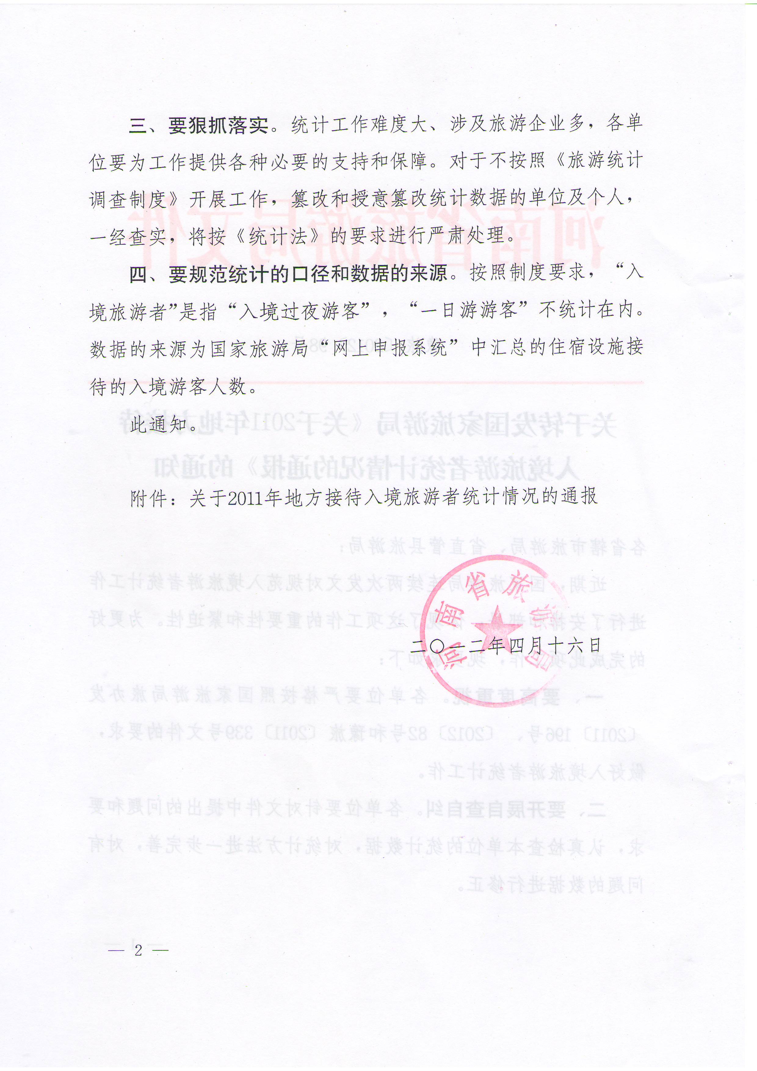 一、要高度重視。各單位要嚴格按照國家旅游局旅辦發(fā)〔2011〕196號、〔2012〕82號和豫旅〔2011〕339號文件的要求,做好入境旅游者統(tǒng)計工作。