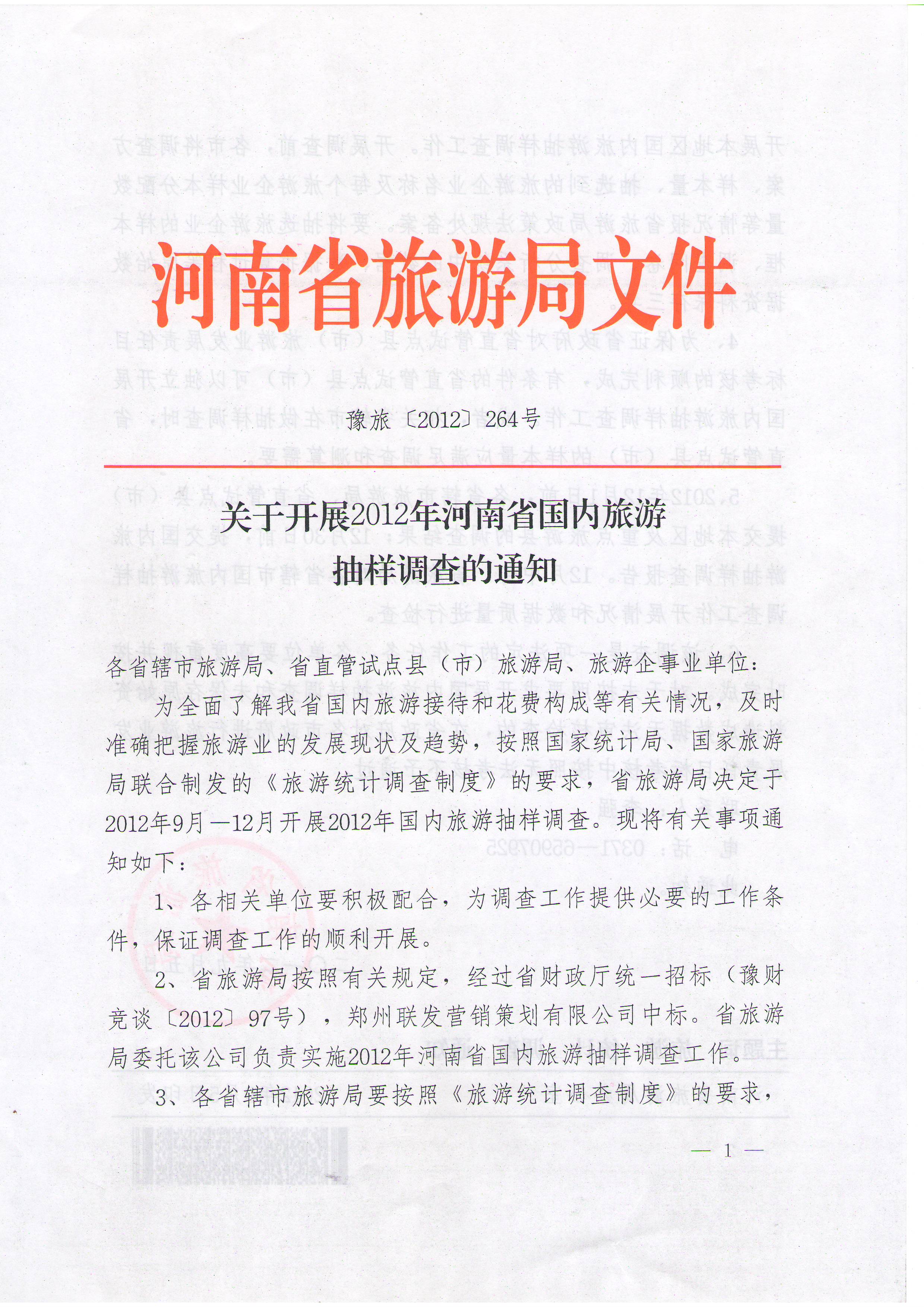 2、省旅游局按照有關(guān)規(guī)定,經(jīng)過省財政廳統(tǒng)一招標(豫財競談〔2012〕97號),鄭州聯(lián)發(fā)營銷策劃有限公司中標。省局委托該公司負責實施2012年河南省國內(nèi)旅游抽樣調(diào)查工作。