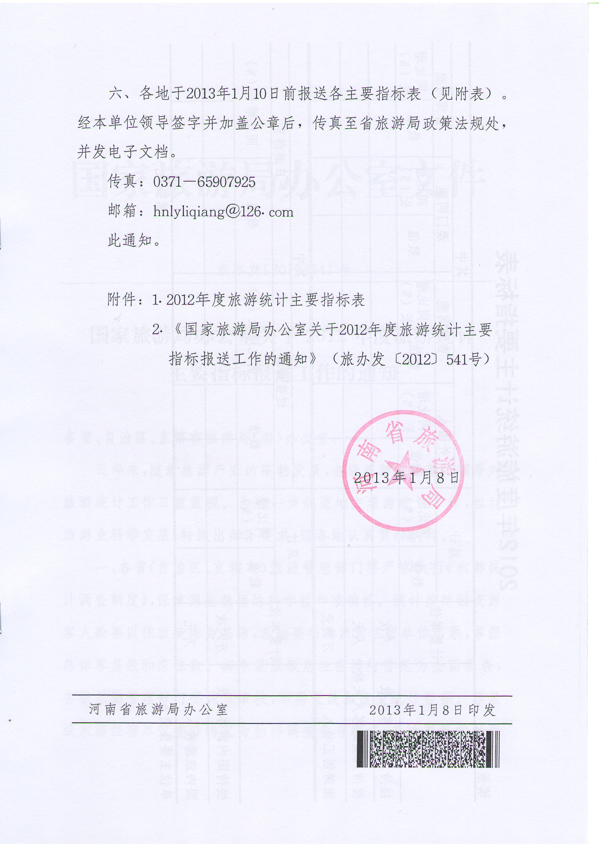 六、各地于2013年1月10日前報送各主要指標(biāo)表(見附表)。經(jīng)本單位領(lǐng)導(dǎo)簽字并加蓋公章后,傳真至省旅游局政策法規(guī)處,并發(fā)電子文檔。