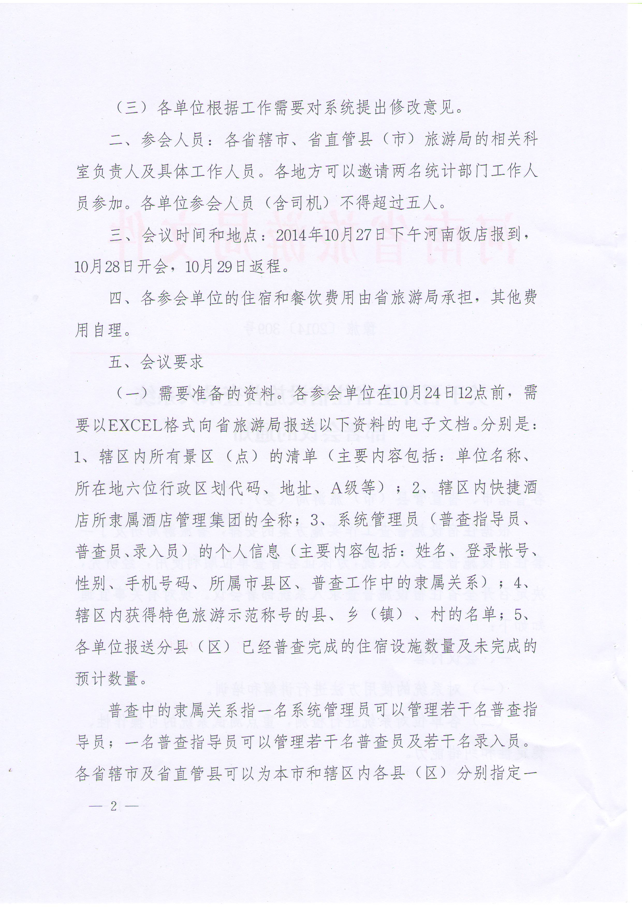 二、參會人員:各省轄市、省直管縣(市)旅游局的相關(guān)科室負(fù)責(zé)人及具體工作人員。各地方可以邀請兩名統(tǒng)計部門工作人員參加。各單位參會人員(含司機(jī))不得超過五人。