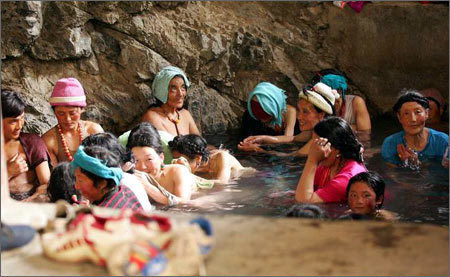 就是剛才那個(gè)笑聲——一個(gè)全裸的藏族少婦正一邊看著我笑一邊梳頭。她側(cè)坐在巖石上,腳伸在熱汽繚繞的水中,歪頭梳著長(zhǎng)發(fā)。她旁邊還有兩個(gè)與她年齡相仿的藏族女人,也邊洗浴邊看著我笑。此情此景,讓我想起某幅西方古典名畫。那幅油畫讓多少人贊嘆不絕、留連忘返,而我眼前的卻是真人。