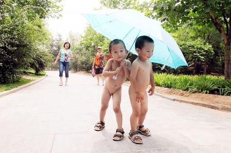 天太熱,“哥倆”打著傘“裸奔”