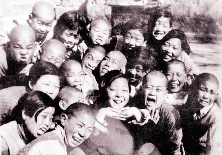 2010年4月13日,記者抵西安時(shí)正下雪。在樊先生之子樊琦家中,我看到一批獅吼劇團(tuán)兒童班的老照片,其中有一張,樊先生著長(zhǎng)衫戴禮帽,張開(kāi)雙臂,盡力把七八個(gè)光頭著破舊棉襖棉褲的男孩子攬?jiān)趹牙,師徒(jīng)_著鏡頭,笑容燦爛。