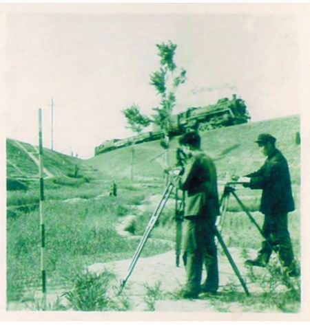 照片上顯示的是1954年初春,鐵路測(cè)量人員正在為修建新鄭鐵局的第一座火車頭體育場(chǎng)而忙碌。當(dāng)時(shí)苗圃街北出口的熊兒河北側(cè)、鐵路文化宮的西邊是一大片荒地。這片荒地正是京廣、隴海兩大鐵路干線的分水嶺。照片上兩大鐵路干線在此“分道揚(yáng)鑣”,一輛老式蒸汽機(jī)車正在緩慢地行駛著。而地面上卻是雜草叢生、溝水蜿蜒、野兔出沒(méi)。測(cè)量人員在春寒料峭中不畏艱苦,正緊張而又認(rèn)真地工作著。