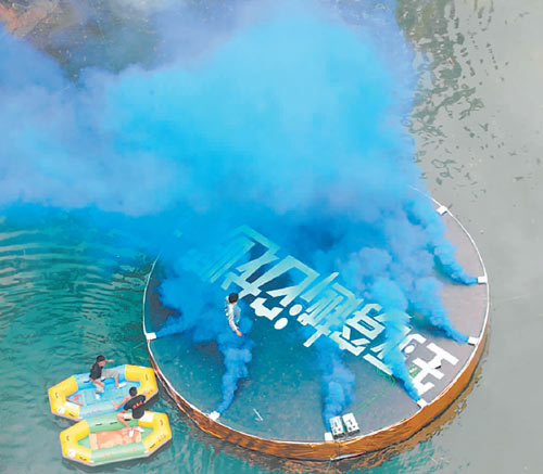 “砰——”11時14分,楊雨辰借助鋼絲繩從50米高的壩堤飛下壩腳,并迅速跳上孤島,4個水雷沖天而響,孤島煙霧彌漫,魔幻女郎從孤島中伸出頭。因煙霧太淡,明顯看出楊雨辰將女郎從窟窿里拉出。