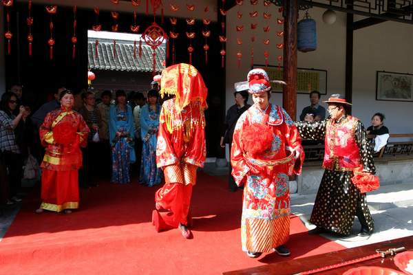 在眾人的簇?fù)硐拢粚?duì)新人跨入客棧門檻,先有新郎后是新娘邁過(guò)絨織臺(tái)階,預(yù)示今后一生平安。在桌前站定后,當(dāng)著眾多的來(lái)賓,新郎用秤桿輕輕揭開(kāi)了新娘的紅蓋頭,露出廬山真面貌的新娘,羞羞答答地施以萬(wàn)福禮致意。接著,新人向長(zhǎng)輩鞠躬敬茶,感激他們的養(yǎng)育之恩,向賓朋鞠躬,感謝他們的光臨。最后夫妻對(duì)拜,鞠躬至頭碰頭,以為相攜白頭,儀式結(jié)束。