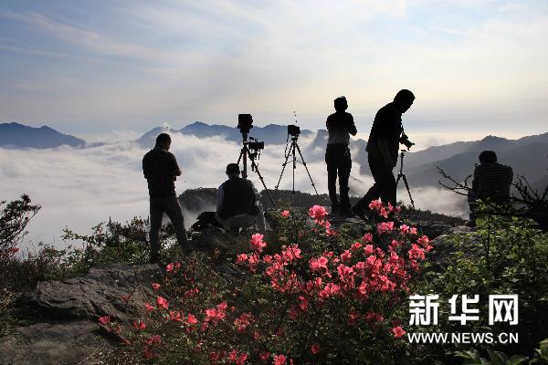 5月11日,幾名攝影愛(ài)好者在廬山五老峰拍攝云海景觀。當(dāng)日,江西廬山風(fēng)景區(qū)雨后放晴,出現(xiàn)了壯觀的云海,漫天的云霧千變?nèi)f化,將廬山裝扮得分外美麗,使游客大飽眼福。