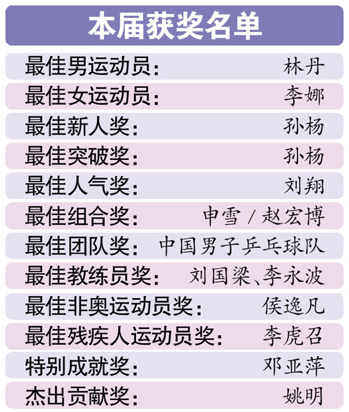 李永波與劉國(guó)梁同獲最佳教練員獎(jiǎng),中國(guó)男子乒乓球隊(duì)獲得最佳團(tuán)隊(duì)獎(jiǎng),申雪/趙宏博再次將最佳組合獎(jiǎng)收入囊中,李虎召獲最佳殘疾人運(yùn)動(dòng)員獎(jiǎng),鄧亞萍獲特別成就獎(jiǎng),姚明獲杰出貢獻(xiàn)獎(jiǎng)。