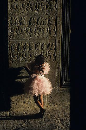 除了天女浮雕,吳哥窟最引人注目的是其建有五座寶塔的主殿。此主殿建在吳哥窟的中心,被三重層層的石砌回廊團團環(huán)繞。從石道盡頭的石階進入回廊后便算進入?yún)歉缈叩闹饕ㄖV灰娀乩鹊膲Ρ谏峡虧M了充滿印度藝術(shù)色彩的精致浮雕,刻劃的都是印度神話里的故事及蘇利亞瓦爾曼二世的生平事跡,精細的雕工,令人嘆為觀止。