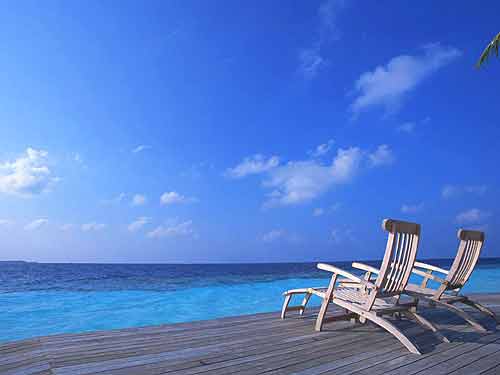 當(dāng)然,要徹底地領(lǐng)略馬爾代夫的靈魂之美,你就得坐上小型飛機(jī)從空中俯瞰。無際的海面上,星羅棋布著如花環(huán)般的小島,猶如天神掉落的藍(lán)色絲絨上繡著的一塊塊翠玉。小島中央是綠色,四周是白色,近岸十?dāng)?shù)米處的透明淺海呈澄亮的淺藍(lán),再遠(yuǎn)些幾十米處在防波堤外的海水則是碧如翡翠般的孔雀藍(lán),而再延伸出去的深海就是深邃的幽藍(lán)。沒有親眼看到過的人真是很難相信這樣的色彩竟然是真實(shí)的,那美到極致的海讓我汗顏,所能使用的形容詞是如此的貧乏。
