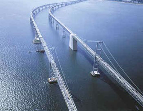 為了方便海灣兩岸的交通往來(lái)和來(lái)此旅游的國(guó)內(nèi)外游客,美國(guó)政府投資興建了切薩皮克灣大橋,并于1964年通車。這一世界最長(zhǎng)的橋梁隧道綜合體全長(zhǎng)37公里,被稱為“現(xiàn)代世界七大奇跡之一”。切薩皮克灣大橋是一座雙向越洋大橋,從諾?说教乩A半島,在切薩皮克灣和大西洋之間架起了一座水上長(zhǎng)廊。在橋中間的人工島上,既可以觀看大西洋灣口、世界最繁忙海運(yùn)航道的壯觀景象,又可以釣魚(yú)、就餐、購(gòu)買紀(jì)念品。另外,大橋每年會(huì)開(kāi)放一次讓公眾步行或騎自行車觀光。
