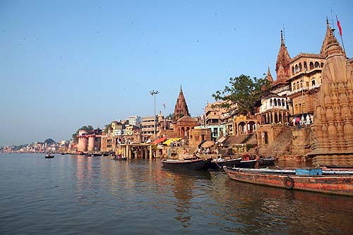 太陽緩緩升起,恒河邊的一切開始生動起來:清晨河上,來自各地的朝圣團(tuán)隊,Varanasi輝煌的一天就這樣開始了。恒河在瓦拉納西緩緩流淌而過。城市沿河的右岸而建,各類廟宇和旅館鱗次櫛比,密密麻麻擠在一起的,或是各州王候朝拜投宿的神廟宿處,或是有錢人家的宅邸,或是神廟的高聳尖塔,或是涂著原色的神像等,混雜著綿延七八公里長,沒有間斷。而在河的對岸,卻是一片不毛之地。傳說很多,但其中最有說服力的說法是因為信徒們相信在恒河中沐浴,面對旭日朝拜最為靈驗。因此,沐浴場都向東建造,結(jié)果整座城鎮(zhèn)就靠一邊發(fā)展了。