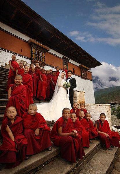 在不丹,一般平民成婚并無婚禮,只有王室人員才可享此權(quán)利,更遑論是外來游客。梁朝偉劉嘉玲選擇及能夠在不丹結(jié)為夫婦,除了兩人是虔誠佛教徒,亦是在曾志偉穿針引線下認(rèn)識不丹國王,而獲安排到國王自資興建的酒店內(nèi)行禮。嘉玲在偉仔的婚事在當(dāng)?shù)匾咽鞘⑹乱粯,不丹王室還特別打破慣例、提供皇宮的寢室給新人拍攝婚紗照,當(dāng)天嘉玲與偉仔都穿上不丹的傳統(tǒng)國服入鏡,同時由不丹皇叔夫婦(即將登基國王之叔)特別親自為這對新人著裝,據(jù)了解偉仔的禮服正是當(dāng)年皇叔結(jié)婚所穿的禮服,而嘉玲所穿的禮服則是王妃他們?yōu)槟陜H兩歲的女兒日后出嫁所準(zhǔn)備的嫁衣。王室認(rèn)為他們和嘉玲、偉仔十分有緣,兩人才會選在不丹完婚,因此他們希望可以給予這對新人最多的祝福。