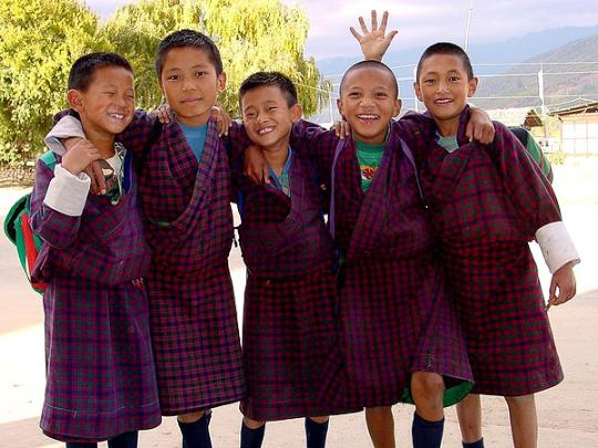 如今的不丹,是一個幾乎全民信教的國度,歷史文化均籠罩在西藏文化的強烈影響下。這里到處充滿著熟悉的佛教氣息,甚至人們的著裝、形象,都是典型的藏人氣質(zhì)。據(jù)說,不丹王國制定了法規(guī):每個國民外出時,必須身著國服,男人穿“幗”(Gho)──連身及膝短袍,女人穿“旗拉”(Kira)──連身長裙和薄外套。國王本人則以身作則,即使在打高爾夫球和籃球的時候,也仍穿著筆挺的幗。