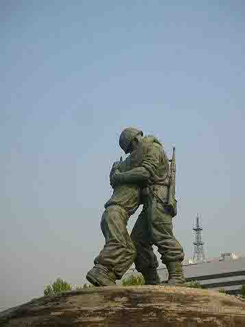日暮時(shí)分,我游蕩在首爾戰(zhàn)爭紀(jì)念館周圍,聳立在我面前是一座的雕像,雕像里,兩名士兵在相擁,從他們著裝可以看出彼此是敵人。