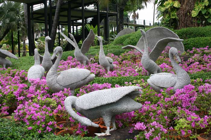 在東芭樂園,除了可以參觀文物館里陳列的珍奇古董,可以觀看展現(xiàn)泰國(guó)文化傳統(tǒng)和風(fēng)土人情的民族歌舞,以及大象踢足球、跳舞、拔河等異彩紛呈的表演外,而更令人賞心悅目的是,由眾多鮮花組成的碧草如茵、花木遍植的宜人景色。在這個(gè)號(hào)稱世界十大蘭花圃之一的蘭花園里,數(shù)十萬株蘭花芬芳撲鼻,爭(zhēng)奇斗艷,仙人掌花圃中,各種各樣的仙人掌千奇百態(tài),風(fēng)姿動(dòng)人,如詩如畫。據(jù)介紹,這個(gè)田園詩畫的樂園是曼谷一個(gè)富商家族經(jīng)營(yíng)的,早在帕他雅還默默無聞的時(shí)候,這個(gè)家族買下大塊土地廣植椰樹,隨著帕他雅從一個(gè)小漁村搖身變?yōu)閲?guó)外游人青睞的“度假天堂”時(shí),東芭樂園也成為到帕他雅游客少不了要去的地方。