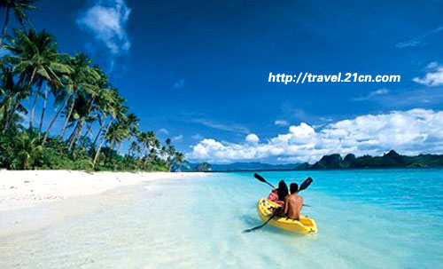 在馬尼拉乘內(nèi)陸航班飛行約一個(gè)小時(shí)來到Catalan島,隨后再乘坐當(dāng)?shù)刂摹绑π反˙angka)”,十幾分鐘后就可以到達(dá)號(hào)稱世界四大最美沙灘之一的長(zhǎng)灘島。螃蟹船行將靠岸,享有“世界上最細(xì)的沙灘”之美譽(yù)的白沙灘(White Beach)在透明碧藍(lán)的波濤前延伸開來。海邊椰林搖曳,很多美女披著一襲輕紗徜徉于椰樹間, 藍(lán)天、碧海、清風(fēng)、白沙……遠(yuǎn)離塵囂的天堂近在咫尺。