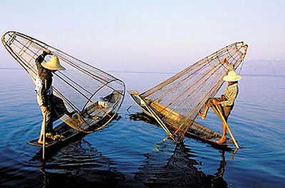 船從運(yùn)河進(jìn)入湖口后,水面豁然開朗,霧靄中的兩面群山,沿湖列席向南。湖水清淺,看得清順?biāo)h忽的水草。早起的水鳥掠過(guò)水面,留下忸怩的叫聲。水面遠(yuǎn)遠(yuǎn)近近,已有不少勤勞的漁民在作業(yè)。這是茵萊湖的奇觀之一:一葉扁舟上,一成年男子立于船頭,手舉高約一人的喇叭形罩網(wǎng),單腿夾了船槳,一邊劃動(dòng)小船,一邊觀察水下動(dòng)靜。待到下網(wǎng)之后,即以一長(zhǎng)長(zhǎng)的竹竿攪擾罩網(wǎng)中的水草,直到逃竄的魚兒卡在網(wǎng)上為此。劃船過(guò)程中,漁人的身體姿勢(shì)十分優(yōu)雅,斜身蹺腿蹬腿,整個(gè)身體和小船成為一體,槳板起落處,船無(wú)聲漂曳前行,槳板帶起的一串水珠,也是落水無(wú)聲。據(jù)說(shuō)這種獨(dú)特的捕魚方式,有著十分重要的保健意義,因常年生活在湖上,漁人們?yōu)楸苊怆p腳的行走功能退化,遂發(fā)明了這種原始又獨(dú)特的劃槳姿勢(shì)。不過(guò),在僅可容身的小漁舟上,不可有太大的動(dòng)靜,既要保持平衡,又要忘情作業(yè),沒有一番艱苦的訓(xùn)練,恐怕很難身懷如此絕技。