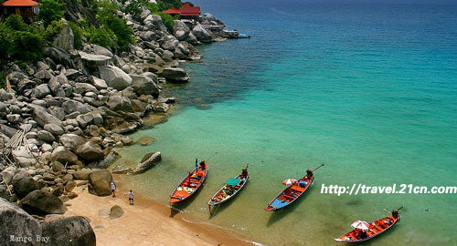 從蘇梅島的碼頭出發(fā),乘坐小型游艇,就可以便捷地前往這些小島。在80幾座離島當(dāng)中,倒島(KoTao)最為著名,這座外形頗像烏龜?shù)男u是泰國(guó)最有名的潛水勝地。靠近倒島,簡(jiǎn)直為當(dāng)?shù)氐暮S蛘鄯,平靜的海面、清可見底的海水甚至叫人誤認(rèn)為河水,似乎只有咸咸的味道才能證明其純正的品質(zhì)。由于海水清澈,水下景觀豐富,倒島四周市場(chǎng)云集著配備各種專業(yè)裝備的潛水高手。倒島當(dāng)?shù)匾查_設(shè)著適合不同水平學(xué)員的潛水訓(xùn)練班,當(dāng)然潛水需要一定時(shí)間的學(xué)習(xí)才能取得資格證書,如果只隨便游玩的話,戴上泳鏡的簡(jiǎn)單浮潛也會(huì)頗為有趣。值得留意的是,海下的珊瑚巖很容易劃傷手腳,一定要避而遠(yuǎn)之。另外,為了保持生態(tài)環(huán)境,當(dāng)?shù)夭蝗菰S從海中私自撈取海星、貝殼之類的海水生物,對(duì)這些感興趣的朋友一定要注意。游泳之后,踏上倒島,品嘗一下當(dāng)?shù)氐募页2艘矔?huì)別有滋味。