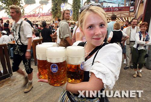 這是2007年9月23日,一名女侍者在德國慕尼黑啤酒節(jié)上為游客送啤酒。