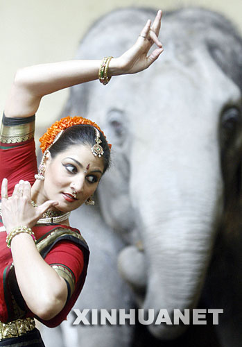 這是2007年2月23日,在德國柏林舉行的國際旅游節(jié)活動(dòng)上,一名來自印度的舞者在一頭大象前面表演。