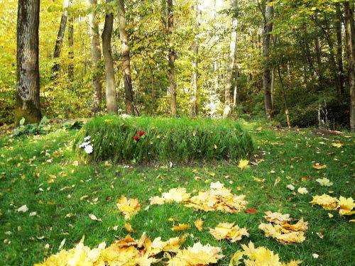 如果不是同伴做向導,我一定會錯過托爾斯泰墓?催^了那么多豪華的名人墓,我簡直不敢相信眼前被樹草掩蓋著的地方竟是一代文學大師安息的墓地。那是一個兩米長半米寬、高出地面四五十厘米、被綠草緊緊覆蓋著的土丘。沒有墓碑,沒有文字,甚至沒有任何標志,可墓前一束嬌艷的鮮花卻告訴了我們,人們并沒有因墓地的自然簡陋而淡忘他的主人。