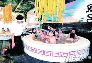 日本一家溫泉浴場(chǎng)14日推出別出心裁的“拉面浴”,引來(lái)不少人躍躍欲試。頭頂“拉面”、泡在盛滿料湯的“面碗”中,洗浴者“別有一番滋味上心頭”。推出“拉面浴”的浴場(chǎng)位于日本本州島東南部溫泉度假勝地箱根,一向以創(chuàng)意頻出而著稱。它提供多種特殊溫泉浴服務(wù),比如主打地方風(fēng)情的古羅馬溫泉浴、土耳其桑拿浴以及與飲食相關(guān)的“紅酒浴”、“米酒浴”、“咖啡浴”、“綠茶浴”,去年甚至推出“咖喱浴”!拔蚁M氤龈嗪命c(diǎn)子,給人們帶來(lái)驚喜!弊籼僬f(shuō)。