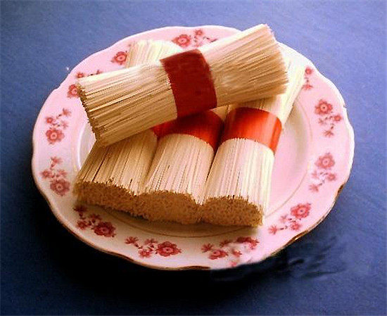 潢川貢面:因潢川史稱光州,所以歷史上稱“光州貢面”。此面系清油兌水鹽合細(xì)面粉,經(jīng)過(guò)拌、揉、發(fā)酵、盤(pán)條、上架、拉扯、涼曬、截切等十多道工序制成。潢川貢面具有條如銀絲,色白如蓮,硬而空心,曲而不斷,久而不變,易于保管,隨吃隨拿,用而方便等特點(diǎn)。潢川貢面以精粉和芝麻香油為主料,下適量食鹽、明礬等佐料,面揉合均勻后上架拉制,制成后的貢面條細(xì)如絲,光澤如銀,清馨襲人。貢面的絕妙之處是每根貢面雖細(xì),但皆為空心,呈細(xì)管狀,工藝之精巧令人贊嘆不已。若以雞湯煮面,輔以其他佐料,滑潤(rùn)爽口,鮮美無(wú)比。