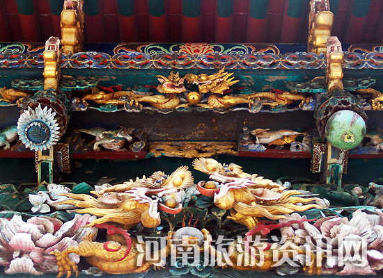 木雕為鏤空透雕,上下寬度達(dá)170厘米,雕刻題材有象征吉祥如意各種瓜果、花鳥、動(dòng)植物、山水、人物、神獸、龍鳳等,雕刻技法精湛,其景物玲瓏剔透,栩栩如生,加之丹青彩畫,更顯得絢麗多彩,金碧交輝。